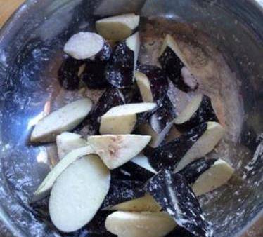 第一步,將茄子切成滾刀塊,然後直接放入盆中,用幹淀粉裹均勻。這裡千萬不要放水。