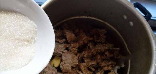 撈出氽過的牛腩放在高壓鍋裡,加薑片和其它調料