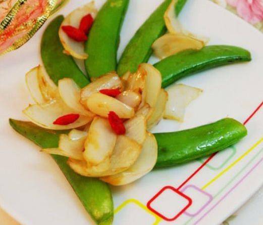 甜豆炒百合:甜豆分別從兩頭摘去老筋,洗凈,新鮮百合洗凈,在兩頭切一刀,分散成小片,枸杞洗凈待用,鍋燒熱,放少許橄欖油,待油燒熱,放入甜豆翻炒一分鐘,放入百合和枸杞翻炒2分鐘,放入蠔油,炒勻即可,一起嘗嘗看。