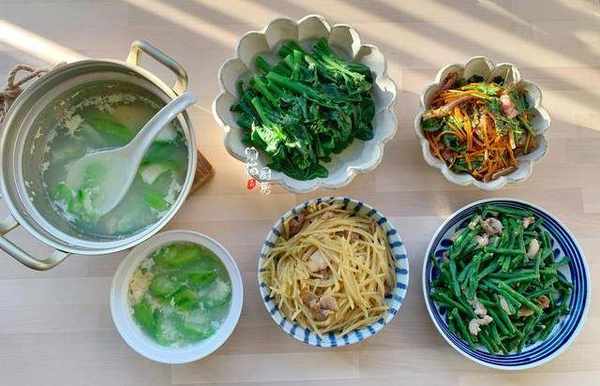 晚餐一:絲瓜咸蛋湯、鹽水芥藍、涼拌豬耳、瘦肉炒土豆絲、瘦肉炒豆角