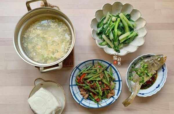 晚餐二:節瓜雞蛋湯、清炒白菜苔、清蒸鱸魚、四季豆炒五花肉