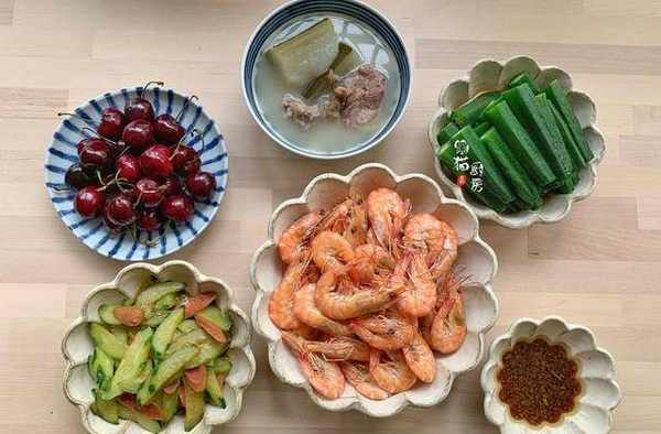 晚餐六:冬瓜薏米湯、白灼秋葵、白灼蝦、黃瓜炒火腿、櫻桃
