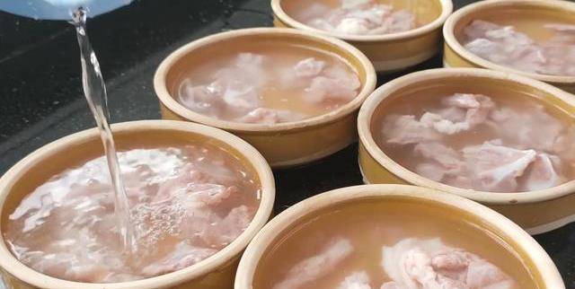 第三步:準備幾個缽仔,把拌好的豬肉分別放在裡面,再加入適量的清水,八分左右滿就可以瞭。