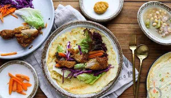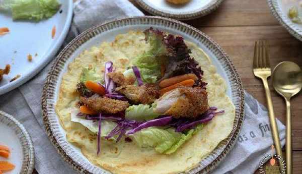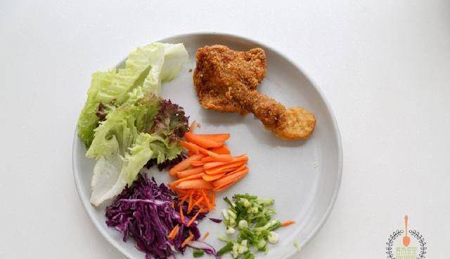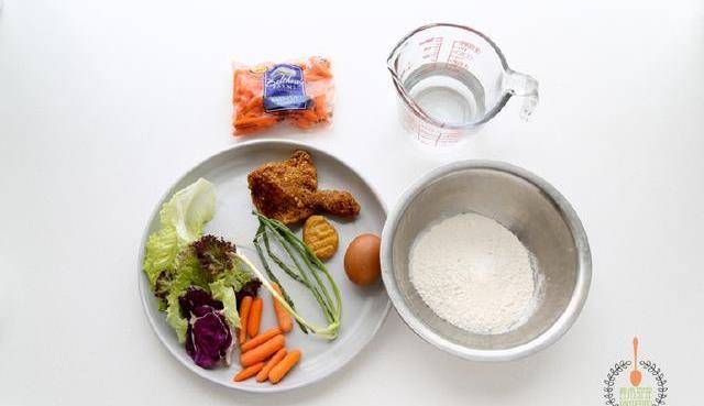 雞肉兩塊面粉一杯雞蛋一個生菜幾片小胡蘿卜半袋紫甘藍三片蔥一根鹽適量