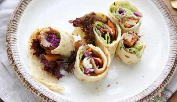 5將菜和雞肉放到卷餅上面,自己吃可以多放菜,雞肉已經有味瞭,可以不放醬料。