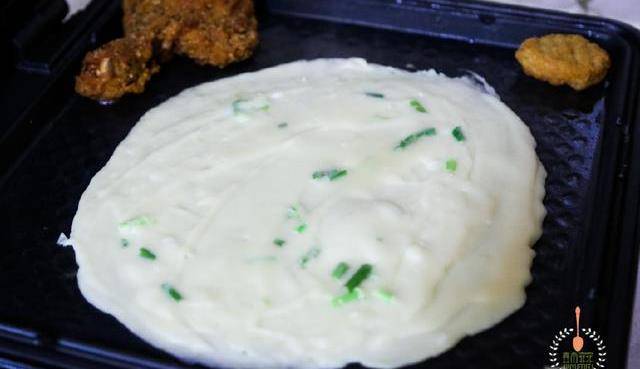3舀一勺面糊到預熱好的電餅鐺,用刮刀攤平,抹圓。將雞塊同時也加熱。