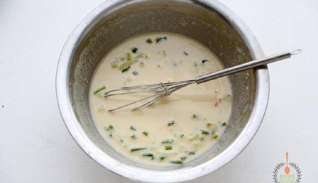 2面粉加雞蛋和水攪拌成稀的可以流動的面糊,放入蔥花和鹽攪勻。