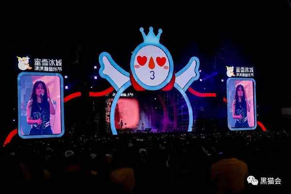 除瞭傳統音樂節必備的超豪華歌手配置,蜜雪冰城還以雪王的形象打造瞭一個近20米的最大雪王造型主舞臺,搭配炫酷燈光給觀眾帶來震撼的視聽體驗。