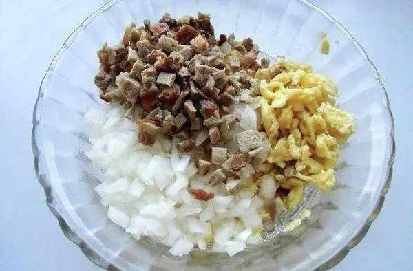 4、把雞蛋、烤鴨肉、洋蔥,加生抽、洋蔥、胡椒粉拌均勻,加花生油拌均勻,包的時候加鹽拌均勻
