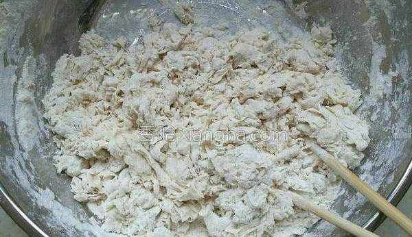 2.面粉放入盆中,邊倒酵母水,邊用筷子攪拌,使面粉完全成為絮狀