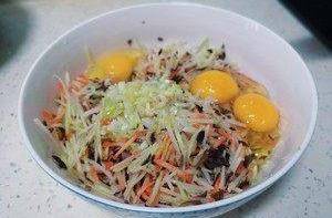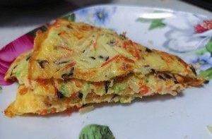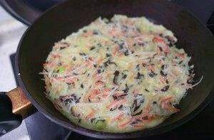 平底鍋刷油,鍋中鋪平蔬菜以及蛋液,使其均勻,薄薄一層即可,開小火,蓋上鍋蓋悶不到五分鐘,如果餅較厚就翻過來再煎一煎