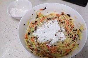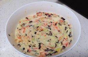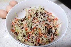 土豆、胡蘿卜、黃瓜去皮用擦絲器擦成細絲,木耳用刀切細絲(蔬菜都可以隨意替換,萵筍西葫蘆這類蔬菜做出來都很不錯)