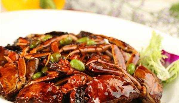 4、下入毛豆,加鮮湯小火燒至蟹肉熟透,收濃湯汁,用濕淀粉勾芡,撒上蔥花,淋入餘下的豬油翻勻,出鍋蟹背朝上放入盤內即成。
