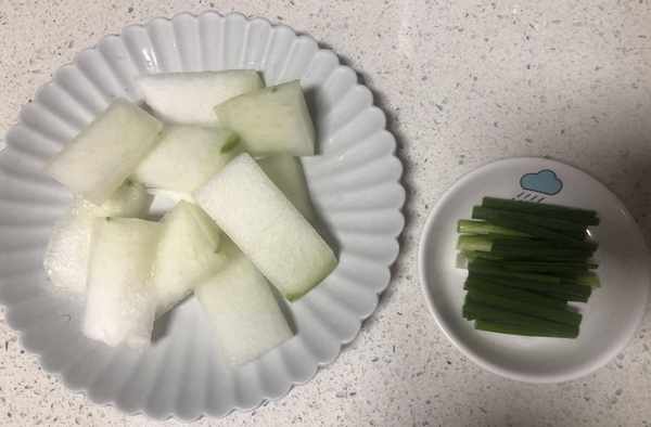 第一步:準備所有的食材,冬瓜去皮洗幹凈後,用刀子切成大小均勻的薄片放進盤中備用。生蔥洗幹凈後用刀子切成蔥段備用。