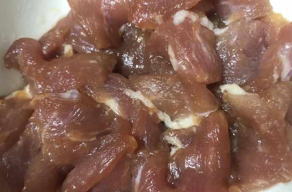 第二步:瘦肉洗幹凈後,用刀子切成薄片,加入適量的花生油,適量的鹽,適量的的生抽和一勺料酒一起攪拌均勻醃制10分鐘備用。