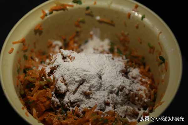 材料:胡蘿卜、香菜、蔥、十三香或五香粉、鹽、雞蛋、面粉、食用油、香油