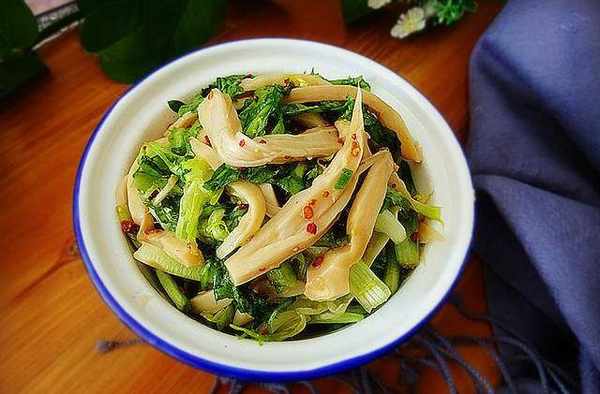 材料:苦菊2顆,杏鮑菇2個,小香蔥2棵,辣椒粉2勺,醬油1勺,醋2勺,糖1勺,芥末籽醬1勺,鹽適量。