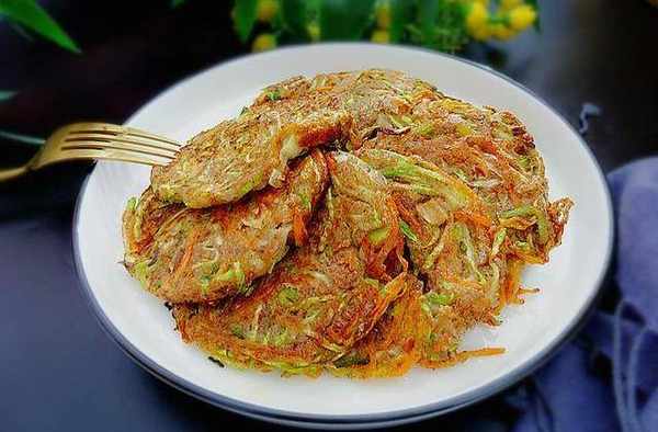 做法:小嫩角瓜,胡蘿卜1根,大蔥1根。把角瓜和胡蘿卜都用工具擦成絲,不要太細,微微粗一點。兩種蔬菜一起用1勺鹽拌勻抓勻,不用使勁揉捏,把蔬菜殺蔫瞭就行,打入雞蛋,再放入切碎的蔥花和一點胡椒粉。把蔥花雞蛋和蔬菜絲等攪拌均勻後放入黑全麥粉。可以先放一部分攪拌下,後面在酌情添加。黑麥和蔬菜絲一起攪拌勻瞭,這時候大面都是蔬菜,因為有雞蛋的作用,菜團發粘,能成型。平底鍋刷油,放入1大勺拌好的蔬菜面糊,按壓平整成將近厘米厚的餅狀。中火烙;翻動,烙成兩面微脆就好瞭。