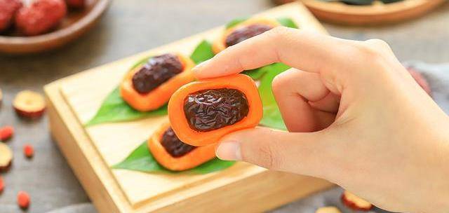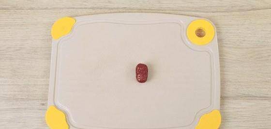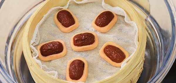10、把切好的劑子用手整成長方形,放入半顆紅棗,用手壓一下。