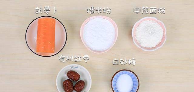 1、準備主料:糯米粉:60克,胡蘿卜:100克,有機紅棗:15克,中筋面粉:30克