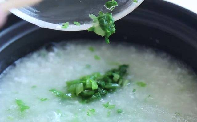 第六步:最後把準備好的銀魚泥和生菜碎倒入鍋中,用勺子適當攪拌30秒,開蓋用中小火燉煮五分鐘左右就可以出鍋品嘗瞭。