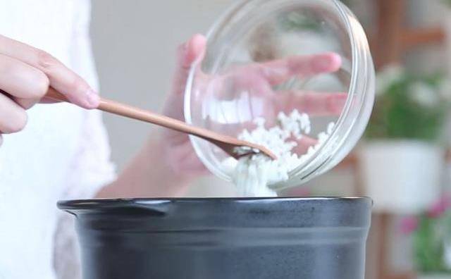第一步:首先我們把大米預先浸泡在清水中一小時,讓它吸飽水分之後,倒入砂鍋中,加入四倍於大米的清水,先開大火煮沸,然後轉小火,蓋上蓋慢煮30分鐘,直至形成粘稠狀的大米粥。