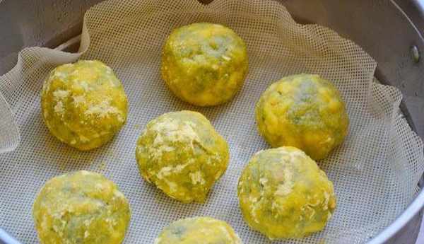 4、鍋中倒入適量的冷水煮開,把篦子上鋪防粘佈,把菜團子放入鍋中篦子上。