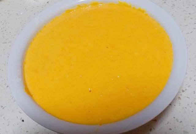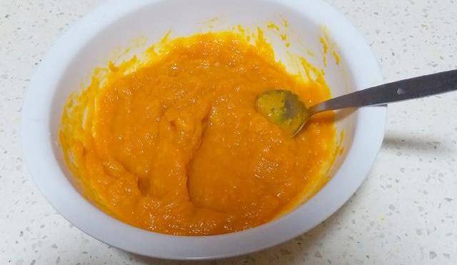 第二步:切好的南瓜片放鍋裡隔水蒸熟,大概八分鐘時間,蒸熟後取出來倒掉盤中水分,用勺子趁熱按壓成南瓜泥備用。