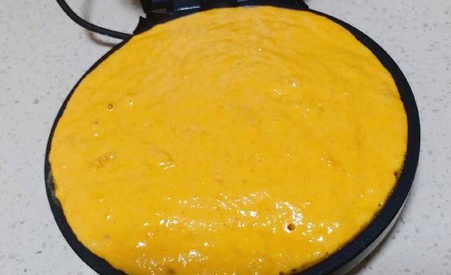 第七步:電餅鐺或平底鍋加熱,刷少許油,把面糊全部倒進去,用勺子底輕輕抹平一下。