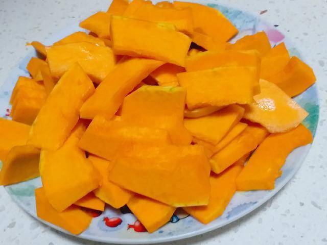 第一步:南瓜去皮洗幹凈後切薄片,我這有400克南瓜,300克用來做南瓜餅,100克用來榨南瓜汁。