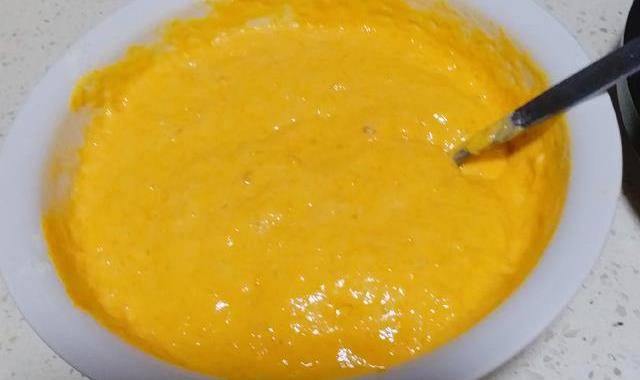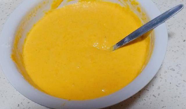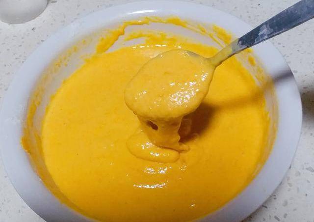 第四步:混合粉加進南瓜泥中,加適量清水,一邊攪一邊加水,不能太幹,也不能太稀,攪至舀一勺起來成這樣的流質狀,面糊就調好瞭。