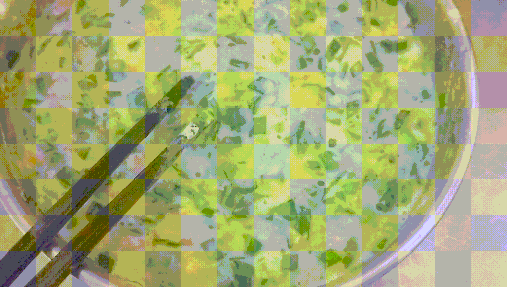 2、一小把韭菜摘洗幹凈,切碎,放入燕麥碗中。再打入兩個雞蛋,攪拌均勻,少量多次加入面粉,邊加邊攪拌,攪至粘稠,再加入適量的清水和鹽,調成面糊,記住不是面漿。