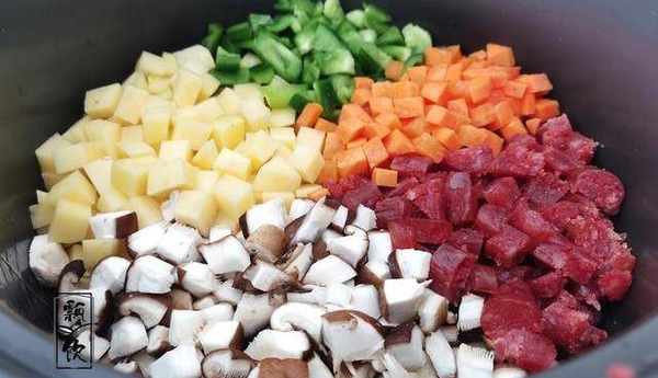 食材:大米1碗,香菇6朵,土豆半個,青椒1個,廣式香腸2根,胡蘿卜1根。鹽適量,蠔油1湯匙,老抽少許,生抽1湯匙,食用油1湯匙。