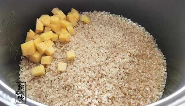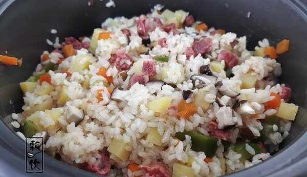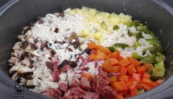3、大米上面,平鋪上土豆、香菇、香腸、胡蘿卜和青椒,加入蒸米飯的水,順著鍋邊輪到鍋中,1碗米加1碗半或兩碗的水量。一般電飯煲火力溫和,1碗米加1碗半的水量便可,但如果使用的是老式電飯鍋,火力較大,水分蒸發多,1碗米就要兩碗水量瞭。放完水,扣上鍋蓋,開始煮飯。