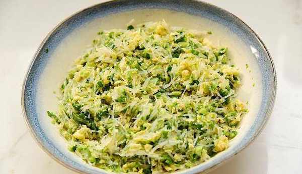 1、把青豆、泡軟的粉絲、炒熟的雞蛋切碎和混合在一起,加入鹽、生抽、蠔油、白胡椒粉、芝麻油、雞粉調味攪拌均勻即可完成瞭,成為餡料備用。