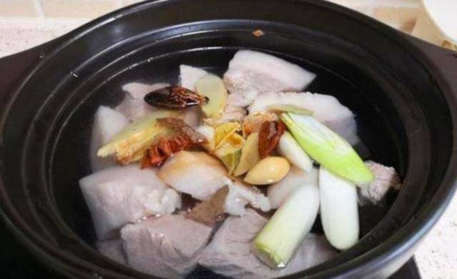 第二步:先煮8個水煮蛋撈出過涼,剝掉蛋殼,雞蛋上再均勻劃幾刀。取一塊兒五花肉清洗幹凈切大塊,冷水下鍋,放入蔥段,加適量料酒大火燒開,撇除表面浮沫,把五花肉撈入砂鍋中。再放入冰糖、蔥段、大料、桂皮、草果,加適量老抽,蓋上鍋蓋大火燒開。