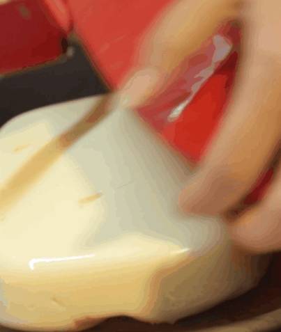 放入芝士片,開小火加熱,邊加熱邊攪拌。註意不能停哦!煮到混合液體變濃稠,半流動狀態即可關火。