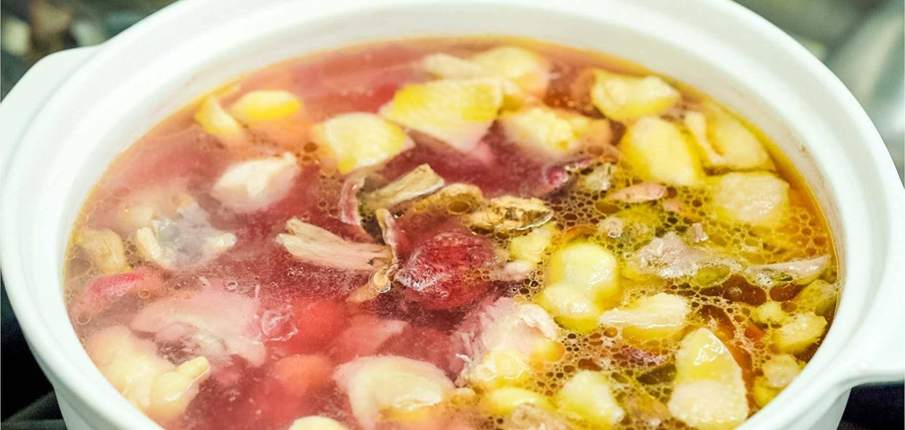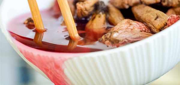 福建紅菇,生長於天然林,是一種野生稀有珍貴的菇品。紅菇粗蛋白為 28.10%,水溶性粗多糖為0.46%,以及含有Cu、Zn、Fe、Mn 等人體必須的多種微量元素,可見其含有豐富的營養。紅菇的幹物粗蛋白含量達26.72%,幹物總氨基酸含量達14.79%,個別種可以達到19.52%,其中含48.9%必需氨基酸。紅菇和山藥也要選擇野生的,這樣味道會更為濃鬱。紅山菇洗幹凈後去掉底部根莖泡在一個大碗中。