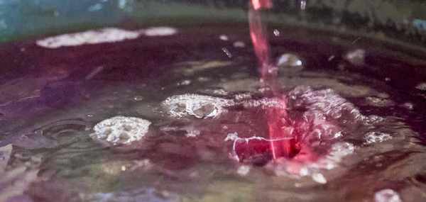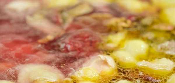 準備一些提前備好的雞湯,也可以用剛才切剩下的雞架熬制。雞湯下入鍋中後倒入剛才泡的紅菇水,開大火把湯燒開下入焯好水的雞塊。