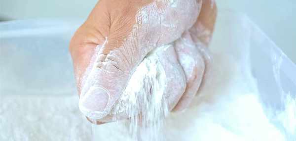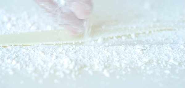 山藥條削好之後放在一個盆中,準備一些生粉均勻撒在山藥條上。這山藥條煮熟之後就是白色的瞭,看起來就像面條一般。