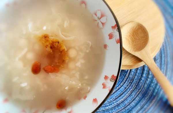 5、將酒釀圓子銀耳羹盛入碗中,舀入一湯匙桂花醬即可。