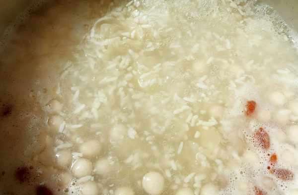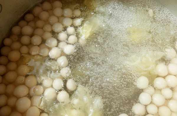 1、鍋中加水燒開,放入泡好的銀耳和糯米小圓子。