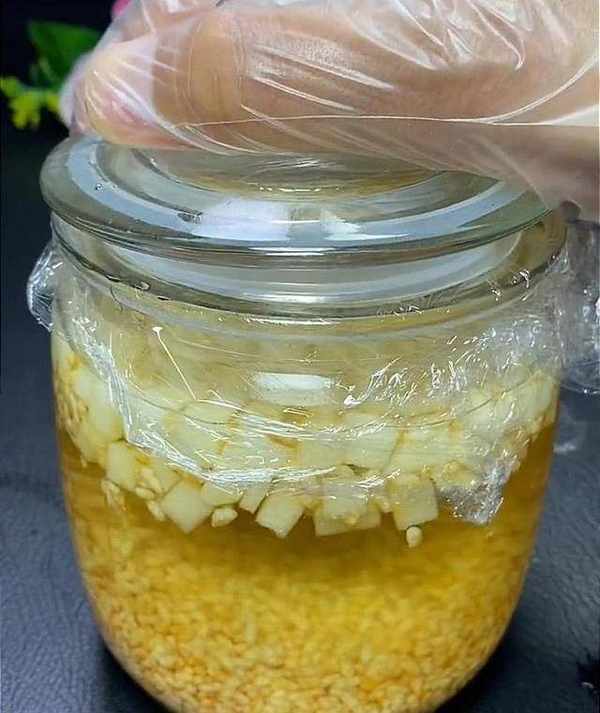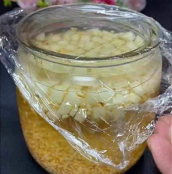 然後,充分地給它攪勻,讓白糖融合在涼白開裡,用保鮮膜把瓶口給它封住,這樣能夠隔絕空氣,蓋上蓋子放在陰涼通風處,靜置15天。
