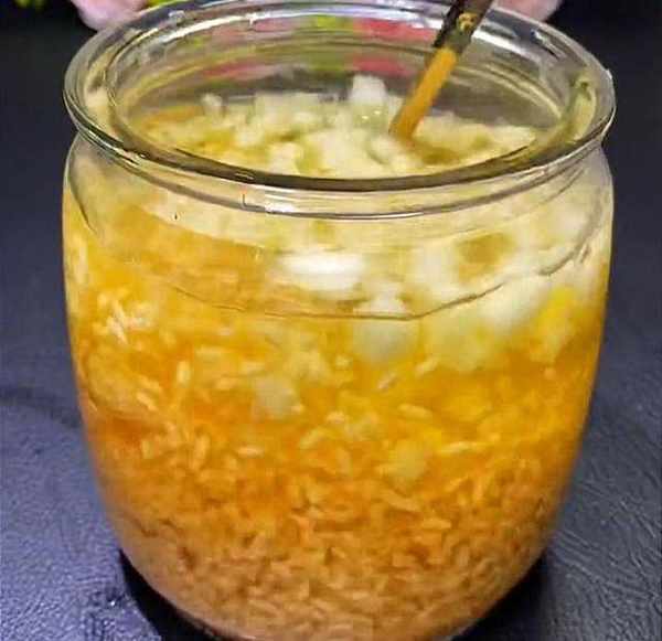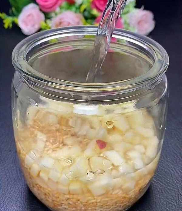 接著,把晾涼的大米裝入這個無油無水的容器裡。註意:一定要把大米放涼,否則的話,在做米醋的時候很容易生花。大米裝好以後,加入準備好的白糖,蘋果丁和晾涼的涼白開。