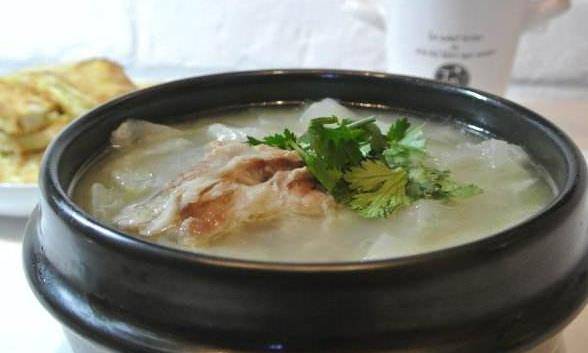 ⒊然後持續中火,保持不至於噗鍋的沸騰狀態50分鐘。加鹽,然後五分鐘關火,撈去薑塊和棵蔥不要,撒黑胡椒碎,起鍋裝盆,就可以瞭,配菜可以挑選自己喜歡吃的,這樣做出來的豬棒骨湯濃白又美味,快試著做做吧