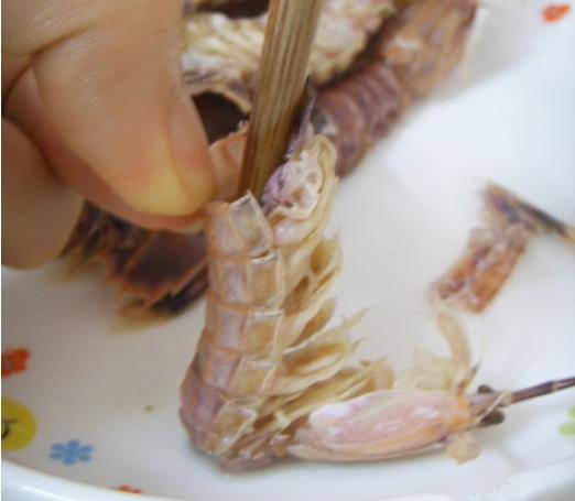 6.用根筷子從尾部貼著蝦殼插到頭附近