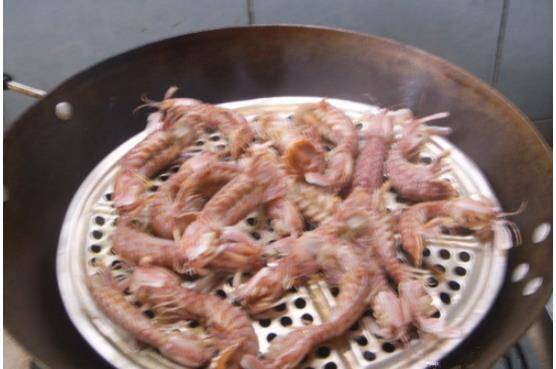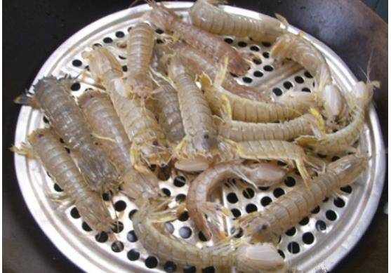鍋裡註入清水燒開後,把皮皮蝦放蒸格上