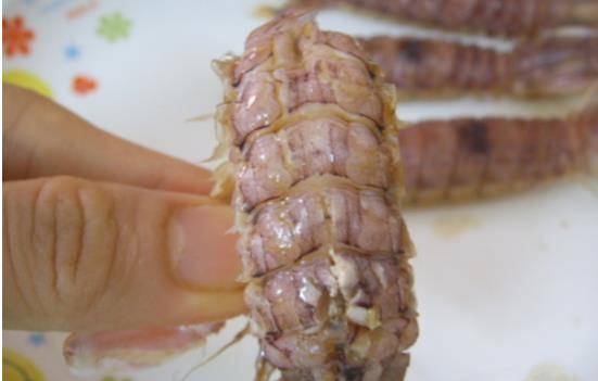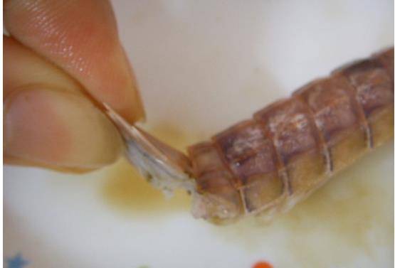 5.把尾部最外面兩個小腳擰斷,然後捏著尾部輕輕往上一折,再擰掉。