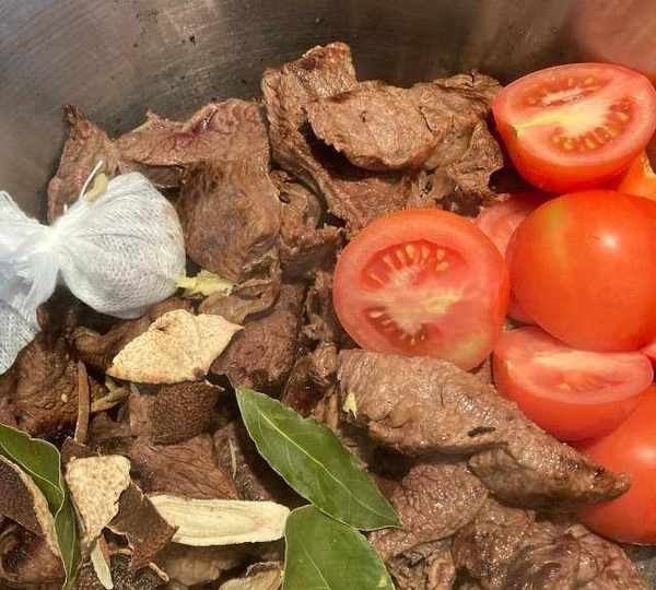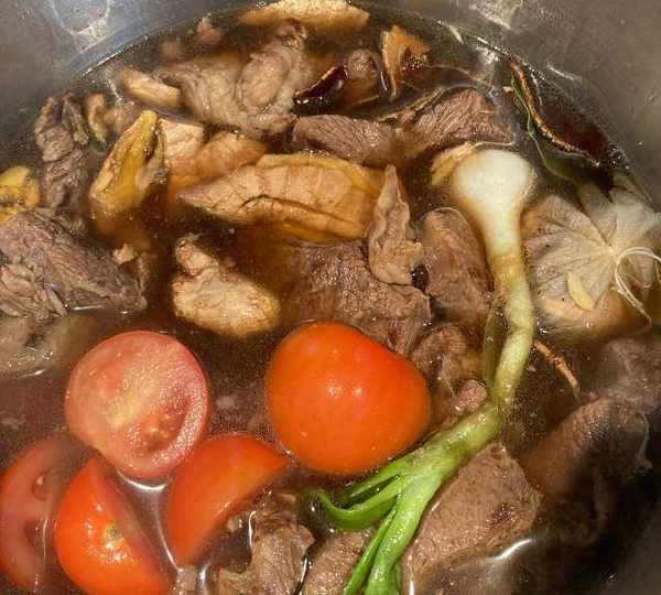 原料:牛腩、番茄、薑、蔥、面條、陳皮、白胡椒粒、香葉、丁香、甘草、八角、生抽、米酒、砂糖。