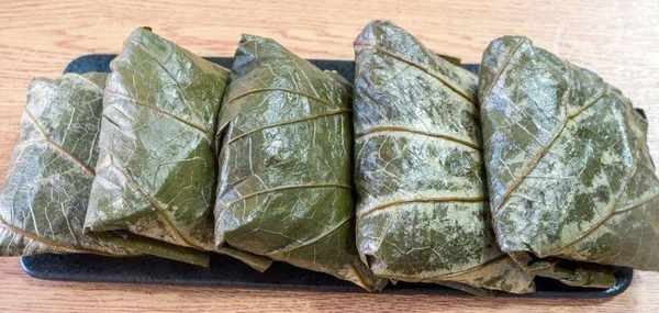 4、糯米煮熟後,倒入醬汁攪均,直接放到荷葉上,添加上香菇、蝦仁、臘腸,用荷葉包裹住食材,放到鍋裡蒸10分鐘,拿出來後即可食用。